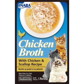 Inaba Churu's chicken broth is a complementary wet food for cats. The variety of chicken and scallop flavored broth is highly appreciated by the vast majority of felines, who cannot resist going for it as soon as it is served to them.