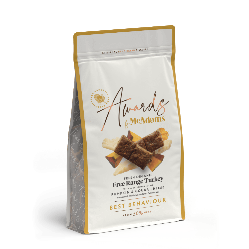 Premios artesanales para perros horneadas suavemente y elaboradas con un 50% de pavo ecológico de granja, boniatos ricos en vitaminas y un delicioso toque de calabaza y queso gouda.
