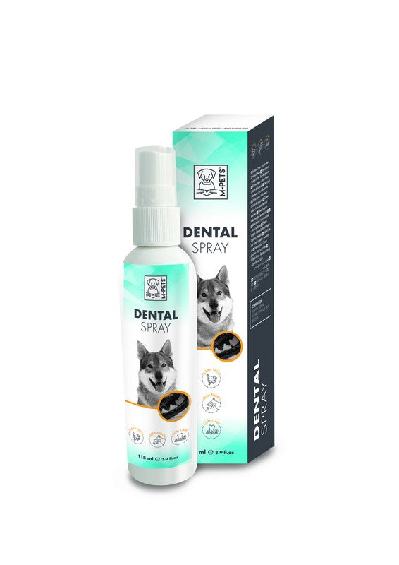 Decile adiós al mal aliento de tu peludito con el Spray Dental para perros y gatos de M-Pets.