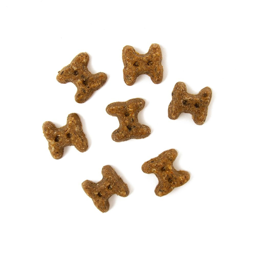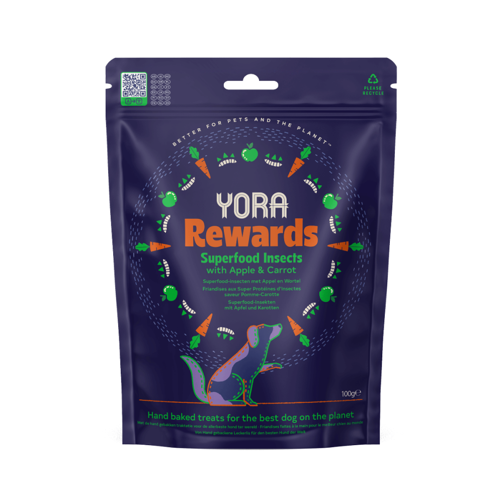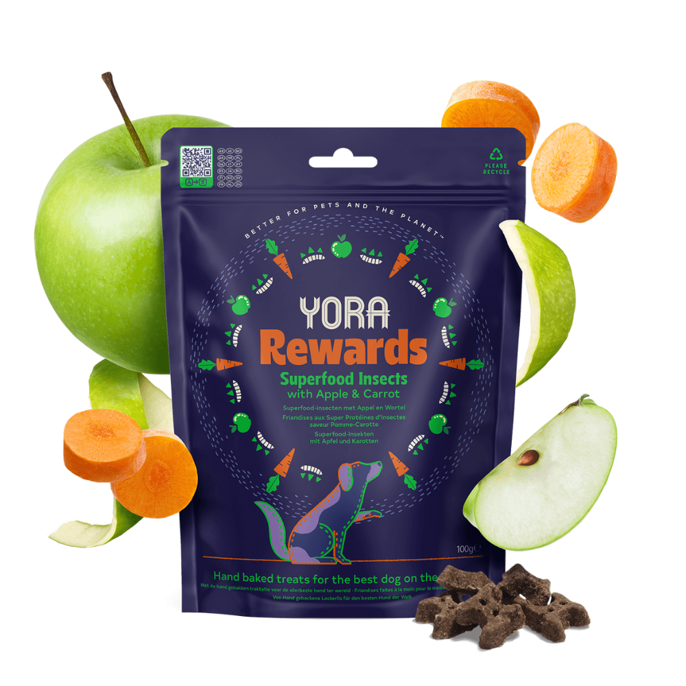 Proteínas de insecto respetuosas con el planeta, horneadas suavemente con avena, zanahoria y manzana para crear pequeñas y deliciosas galletas de alegría. Los perros harán cualquier cosa por una recompensa Yora.