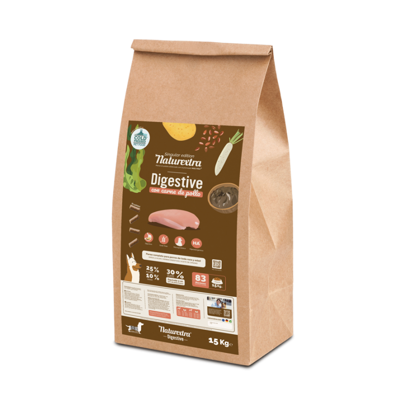 Natural-Extra Digestive® es un alimento completo y equilibrado para perros de todas las razas y edades, especialmente formulado para animales con alergias alimentarias, intolerancias o sistemas digestivos delicados. Su receta hipoalergénica, monoproteica y sin cereales facilita la digestión y ayuda a mantener el equilibrio intestinal.