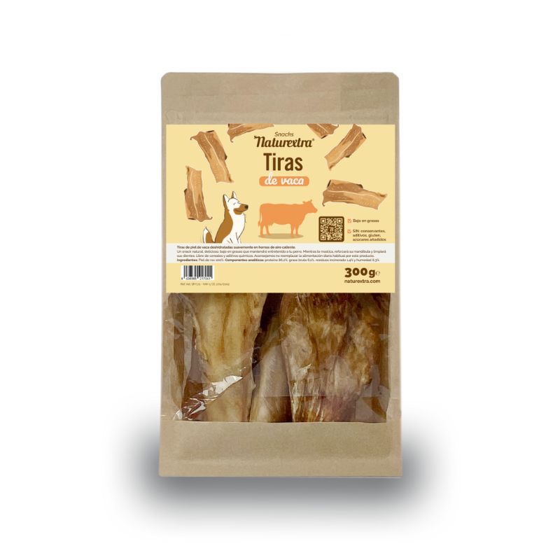 Las tiras de vaca deshidratadas Naturextra son un snack natural elaborado con 100% piel de vaca, desecada lentamente con aire caliente para conservar su sabor y propiedades naturales. Su textura firme y resistente proporciona una masticación prolongada, ayudando a entretener al perro mientras favorece la higiene dental y fortalece la mandíbula.