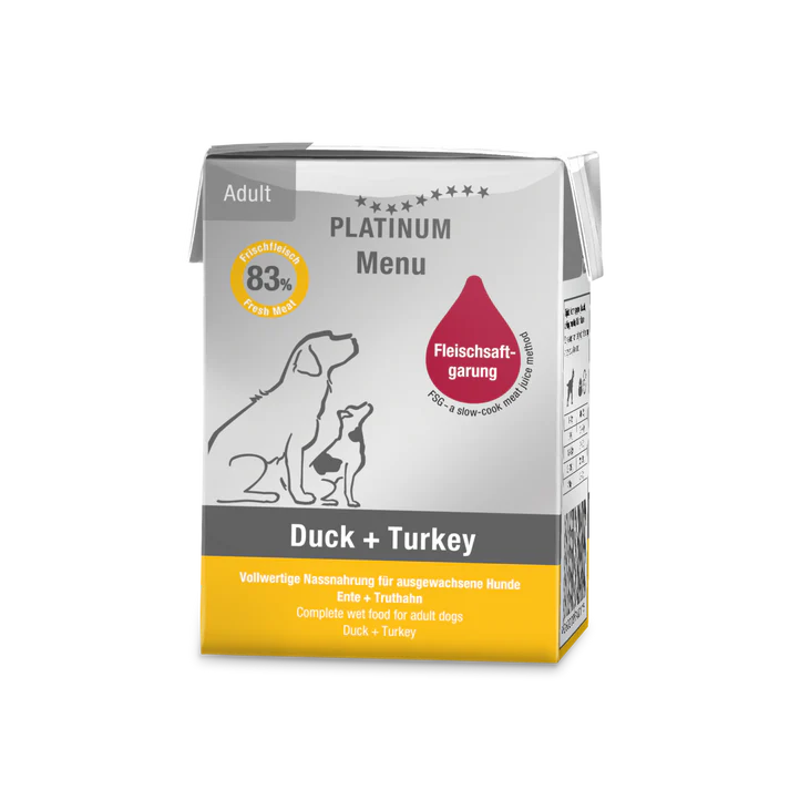 El alimento húmedo Adult Pato y Pavo, elaborada mediante cocción en jugo de carne, está compuesta principalmente de carne cocida y ofrece a tu perro un alimento que es: