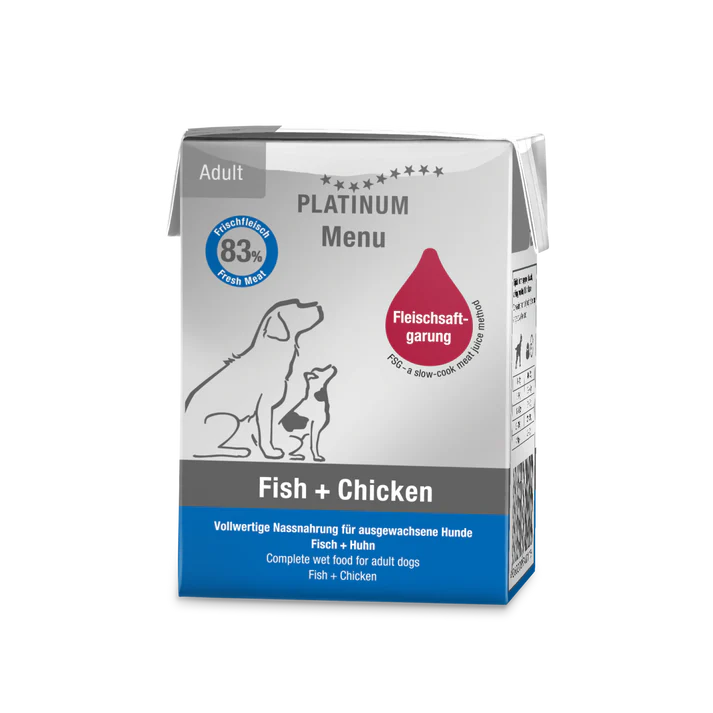 El alimento húmedo Adult Pescado y Pollo, elaborada mediante cocción en jugo de carne, está compuesta principalmente de carne cocida y ofrece a tu perro un alimento que es: